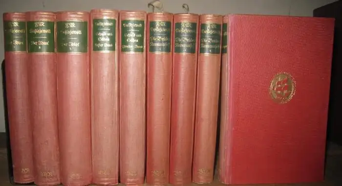 Freie Beschreibung: 18,8 x 12 cm. Rote Original-Leinenbände mit goldgeprägten Rückentiteln auf schwarzen Schildern sowie (teilweise) goldgeprägte Deckelvignetten. Die Bände etwas berieben, an Ecken und Kanten teilweise leicht angestoßen. Einige Bände innen sehr leicht gebräunt, der Band Der Idiot 1 ist zwischen den S. 64/65 leicht angeplatzt, Buchblock und Seiten dennoch fest. Eintragungsfreies, ganz gutes Exemplar