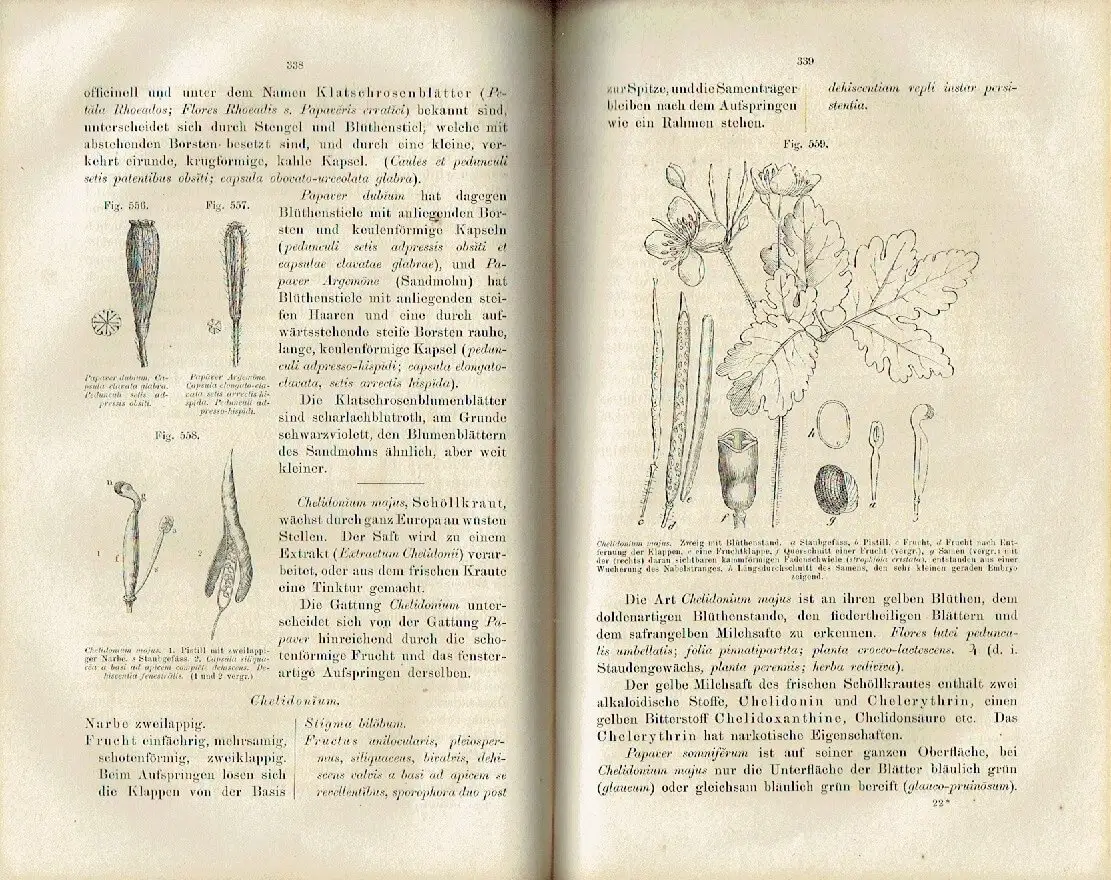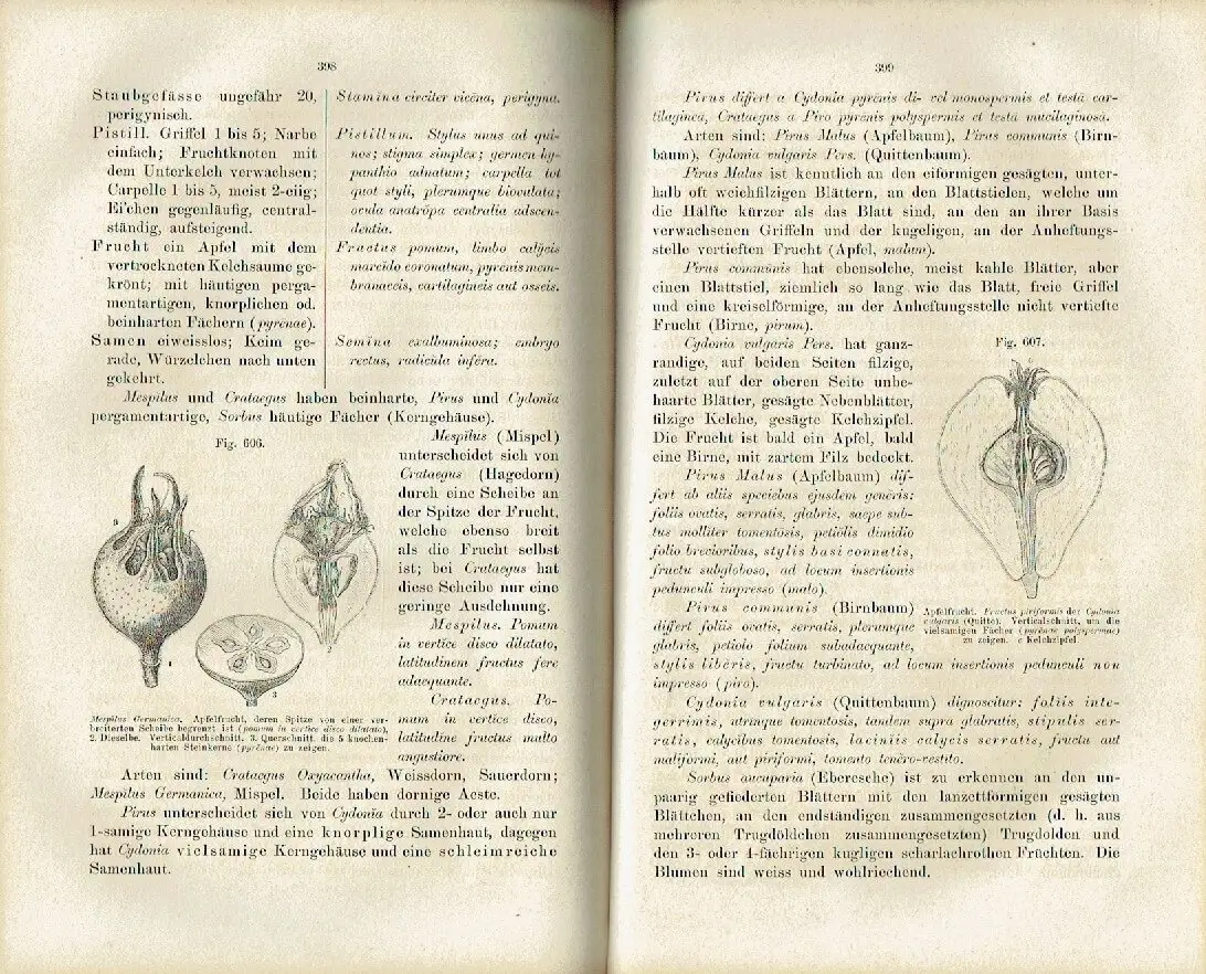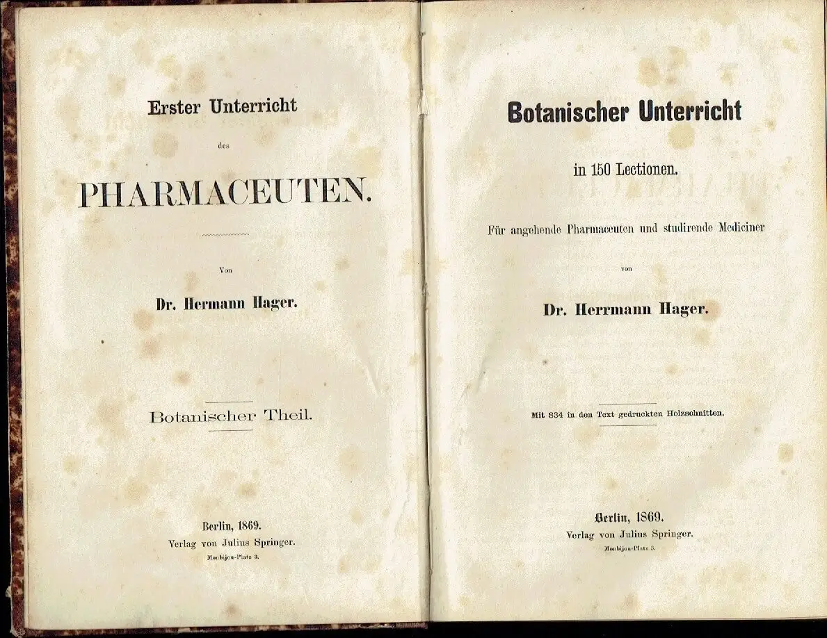 guter Zustand, Gebrauchs- und Alterungsspuren: Einbandecken und -kanten teils gering abgenutzt, teils leicht defekt - etwas verstaubt - Seiten überwiegend sauber und ordentlich, teils etwas alters- oder stockfleckig, die ersten 10 Blatt etwas stärker - alter Besitzername beiderseits der Vorsatzseite - die letzten 60 Blatt am senkrechten Rand mit schmalem Wasserstreifen, Als ein Haupttheil eines botanischen Unterrichts erschien mir eine ausreichende Behandlung der morphologischen Verhältnisse der Pflanzentheile, ohne welche eine diagnostische Botanik, das Endziel der pharmaceutischen Botanik, nicht verstanden und geübt werden kann, dann aber auch der Unterricht in den nothwendigsten Punkten der Physiologie und Histologie, um für das Verständniss der Pharmakognostik eine Grundlage zu gewinnen ... Wenn ich in den etymologischen Erklärungen die griechische Schrift mit lateinischer begleitete, so nahm ich damit Rücksicht auf eine etwaige Realschulbildung dos Lehrlings. In den Lectionen der Systemkunde ist nur das Decandolle'sche natürliche und das Linné'sche Sexual-System commentirt. Das beste aller Systeme, das Endlicher'sche, ist nur in seinen Umrissen angegeben und angewendet. Die beiden ersten Systeme trifft man in den botanischen Werken am häufigsten an, dagegen hat das von Berg für seine pharmaceutische Botanik aus dem Link'schen Systeme aufgebaute System keine Aufnahme gefunden. Eine pharmaceutische. Botanik nach dem Endlicher'-schen System geordnet existirt nicht. Der lernende Pharmaceut ist daher in seinen praktischen botanischen Beschäftigungen auf das Studium desjenigen Systems angewiesen, welches gerade die ihm zur Hand stehende Diagnostik acceptirt hat. Von den pharmaceutisch-botanischen Werken steht in Rücksicht auf wissenschaftliche Fassung und Correctheit Berg's pharmaceutische Botanik, resp. der zweite Abschnitt, die diagnostische Beschreibung der officinellen Pflanzen umfassend, oben au und ist desshalb gleichsam der Ausgangspunkt des botanischen Studiums eines Pharmaceuten. Dies ist auch der Grund, warum ich den diagnostischen Auffassungen Berg's mehr oder weniger folgte und mich der Ausdrucksweise dieses Autors möglichst nahe hielt. Dadurch wird der angehende Pharmaceut für einen nutzbringenden Gebrauch der Berg'schen diagnostischen Botanik vorbereitet. Der Unterricht in der Diagnostik erstreckt sich in dem vorliegenden Werke im Uebrigen nur auf solche Familien, Geschlechter und Arten, welche zu studiren unsere heimische Flora auch Gelegenheit giebt. In Betreff des Studiums der Lectionen halte ich es für nützlich, ein mechanisches Auswendiglernen möglichst zu vermeiden, etwaige Lücken aber in dem Wissen durch Repetition auszufüllen. Das Auffinden des speciellen Stoffes zu erleichtern, ist ein reichhaltiger Index angehängt. In der diagnostischen Botanik ist die Auffassung einzelner Charaktere, auf welchen die Unterscheidung verwandter Familien und Gattungen beruht, durch das Gedächtniss zu unterstützen, und der Lernende sollte es soweit bringen, dass er die wichtigeren officinellen Pflanzen (wie Hyoscyamus, Belladonna, Conium, Chamomilla), ohne dass sie ihm vorliegen, in der Kunstsprache zu, Halbleinen, ca. 15,5 x 23, 636 Seiten mit 834 Holzschnitten