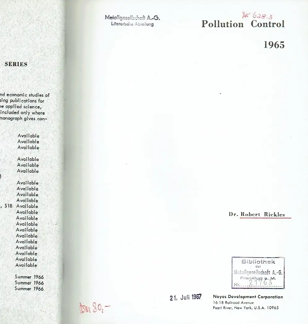 guter Zustand, Gebrauchs- und Alterungsspuren: ehemaliges Bibliotheksexemplar im Interimseinband mit Rückenetikett, Etikett mit Folie überklebt bis weit in beide Buchdeckel hinein - Titel mit Stempeln und Notizen - Deckel innen mit angeklebtem Papierrest - Vorwort mit weiterem Stempel - Seiten aber sauber und ordentlich - Seitenschnitt etwas vergilbt und gering verschmutzt, INTRODUCTION - WATER TREATMENT - Drinking Water Quality - Water Sources - Turbidity and Color Removal - Settling Equipment - Sludge Blanket Equipment - Floc Former and Settling Basins - Disinfection - Removal of Tastes and Odors - Iron and/or Manganese Removal - Water Softening - Cold Lime Soda Process - Iron and Manganese Removal in the Cold Lime-Soda Process - Sodium Cation (Zeolite) Exchange Process - Iron and Manganese Removal in Ion Exchange Processes - Two Step Cold Lime-Sodium Cation - Fluorination - WATER RENOVATION - Water Sources - Separation Processes - Distillation - Long Tube Vertical Multiple Effect - Flash Evaporation - Forced Circulation Vapor Compression - Vapor Reheat - Freezing - Electrodialysis - Reverse Osmosis - Adsorption - Miscellaneous Processes - Economics - Summary - SEWAGE DISPOSAL - Screening - Sedimentation - Flocculation - Disinfection - Biological Treatment - Thickening - Tertiary Treatment - Adsorption - Oxidation Ponds - Economics - Water Pollution Control Market - BIODEGRADABLE DETERGENTS - Detergent Chemicals - Groundwater and Anaerobic Conditions - Summary - SOLIDS DISPOSAL - Garbage - Composting - The Economics of Refuse Disposal - Sewage Sludges - Digestion - Dewatering Drying - Disposal - Incineration - The Economics of Sewage Sludge Disposal - Summary - AIR POLLUTION - Automobile Exhausts - Incinerators - Removal of Particulate Matter - Power Plant Effluents and the Sulphur Oxide Problem - Removal of Nitrogen Oxides - Industrial Air Pollution - RADIOACTIVE WASTE TREATMENT - Liquid Wastes - Gaseous Wastes - High Level Radioactive Wastes, Halbleinen, ca. 21 x 27, 207 Seiten mit zahlreichen Bildern
