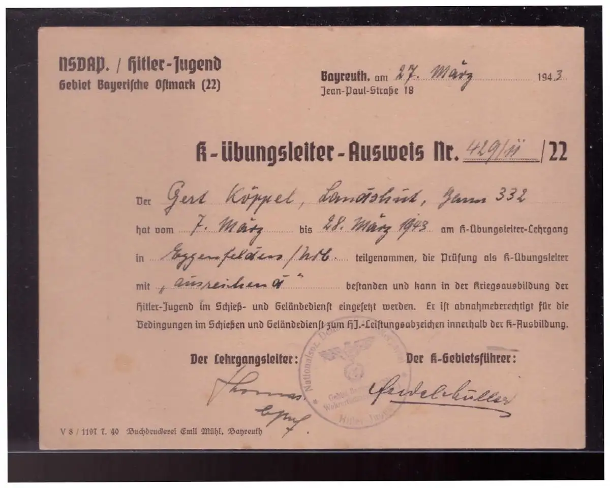 Dt.- Reich (023468) Hitler- Jugend Gebiet Bayrische Ostmark, K-Übungsleiter Ausweis, Eggenfelden 1943