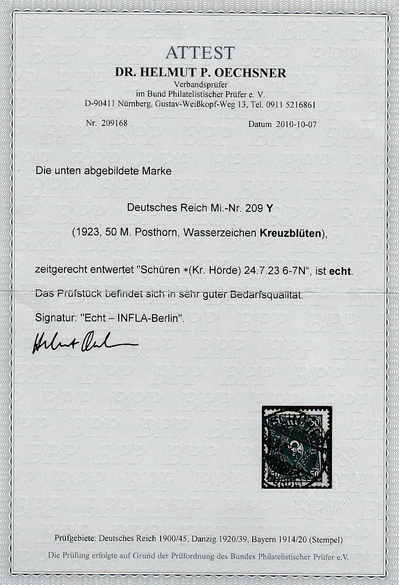 Dt. Reich Infla: Nr, 209 mit Y-Wz, gest., Attest Oechsner BPP