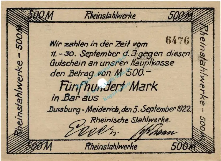 Duisburg , Banknote 500 Mark Schein unc-kfr. Müller 1250.1 , Rheinland 1922 Inflation