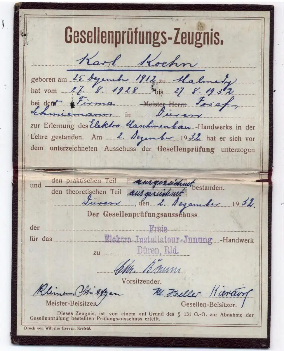 5160 DÜREN, Geselleprüfungs-Zeugnis, 1932