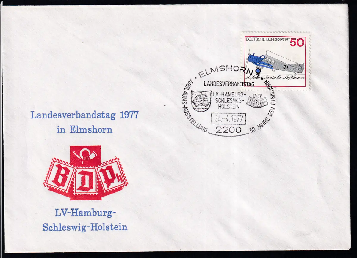 ELMSHORN 2200 JUBILÄUMS-AUSSTELLUNG 50 JAHRE BSV ELMSHORN LANDESVERBANDSTAG LV-HAMBURG-SCHLESWIG-HIOLSTEIN 24,4,1977 auf Sonderumschlag