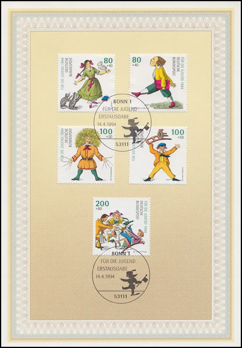 amtliches vierseitiges Ersttagsblatt der deutschen Post mit den Jugend-Sondermarken aus dem Buch Struwwelpeter (Paulinchen, Hans Guck-in-die-Luft, Struwwelpeter, Der böse Friedrich, Zappel-Philipp)