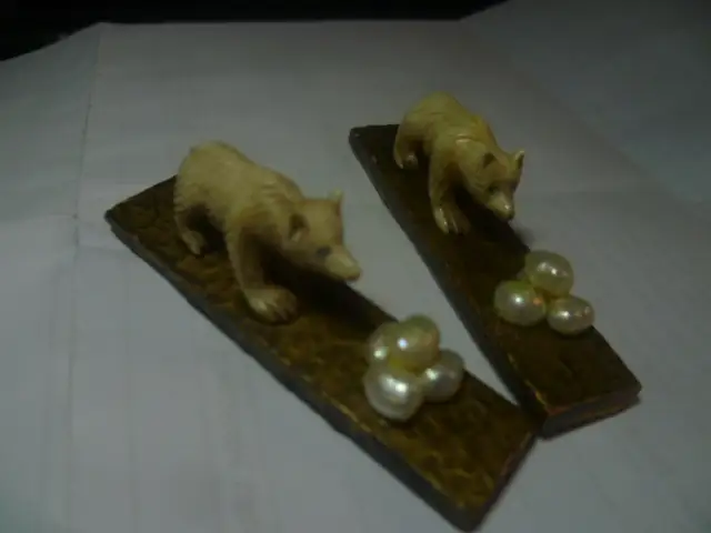 Ebersbacher Horn oder Beinschnitzerei hier 2 Bären auf kleinem Holzsockel spielen mit Süßwasserperlen