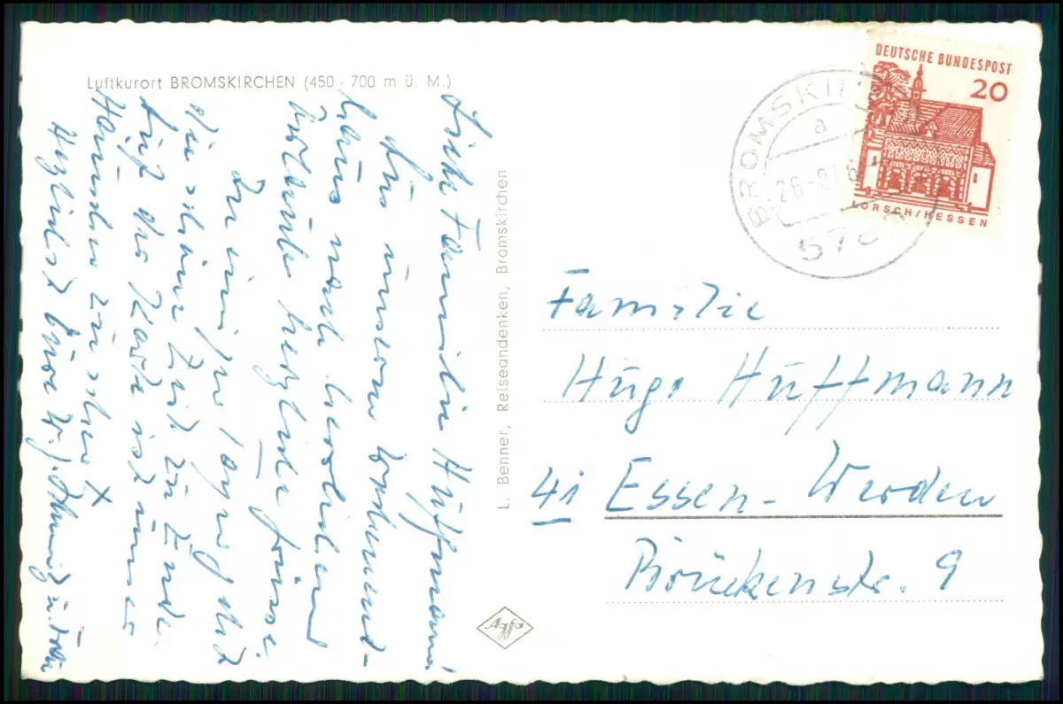 Rückseite / Besonderheiten Gelaufen: 26.08.1968 (Poststempel Bromskirchen) Adressiert nach Essen-Werden Mit persönlichem handschriftlichem Gruß Frankiert mit 20 Pfennig Deutsche Bundespost – Vorschhessen