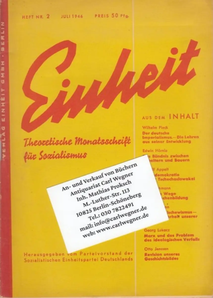 Einheit. - mit Beiträgen von Wilhelm Pieck, Edwin Hörnle, Rudolf Appelt, Thomas Mann u. a: Einheit. -Heft Nr. 2, Juli 1946. Theoretische Monatsschrift für Sozialismus.
