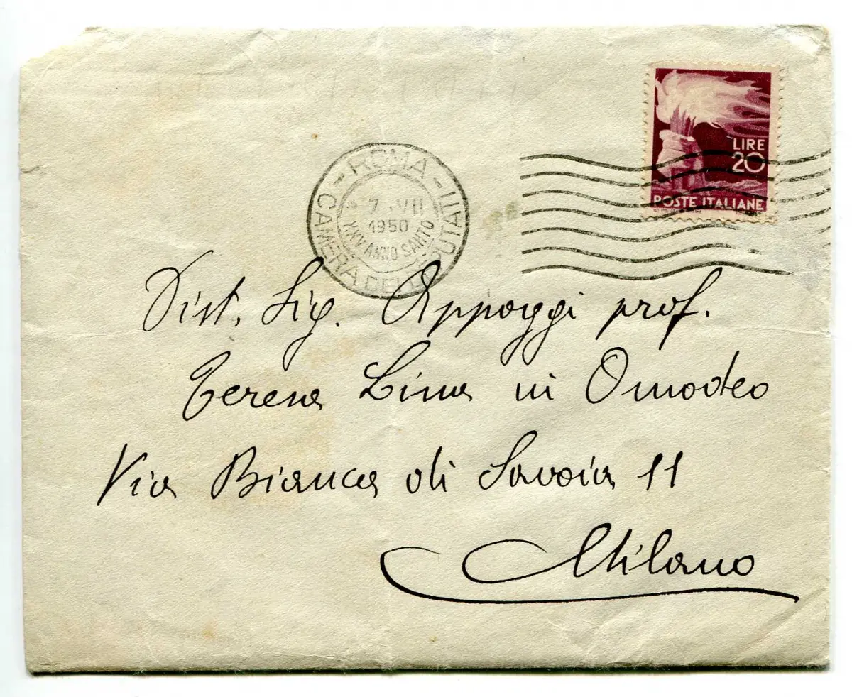 Empfehlungsschreiben - Umschlag von der Abgeordnetenkammer verschickt - Empfehlungsschreiben - Umschlag von der Abgeordnetenkammer am 7.7.50 mit einem schriftlichen und von Herrn Giovanni Gasparoli unterzeichneten Brief, der sich die Versetzung eines Lehrers zu Herzen nahm + ein weiterer Brief mit Autogrammunterschrift von Herrn V. Bertinelli an Gasparoli als Antwort auf Ihre Anfragen - Kuriosität Code 436/3