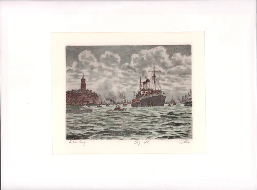 Elbe, Kaispeicher A. Handkolorierte Original-Radierung, Adler, Richard