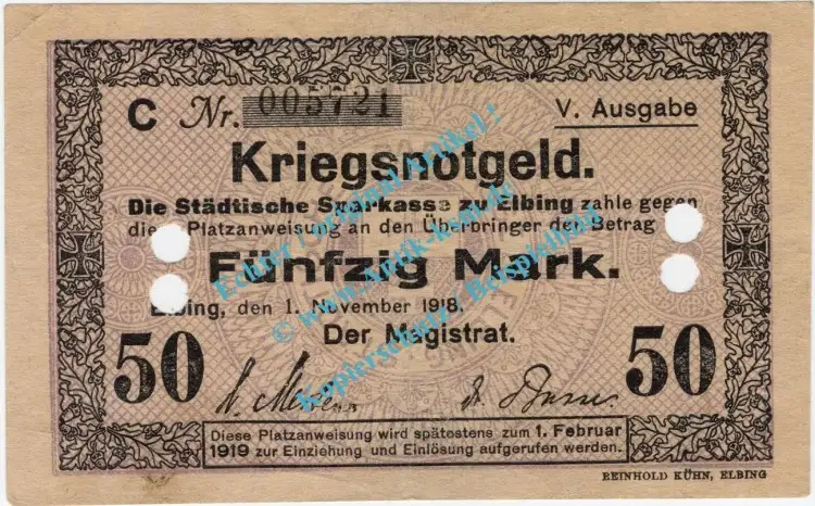 Gutschein / Banknote über Fünfzig Mark , Stadt Elbing , Großnotgeld 1918Bundesland : West Preussen  ,  Geiger : 126.18.a