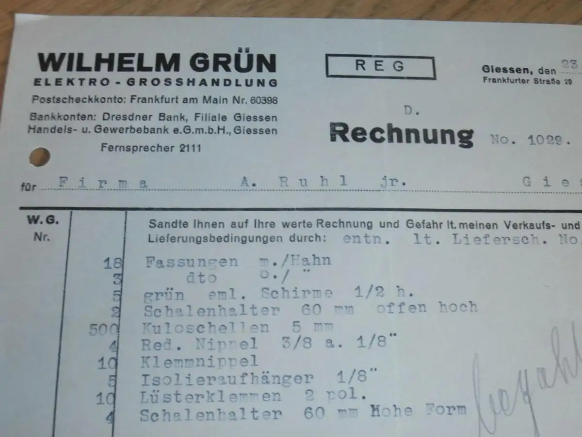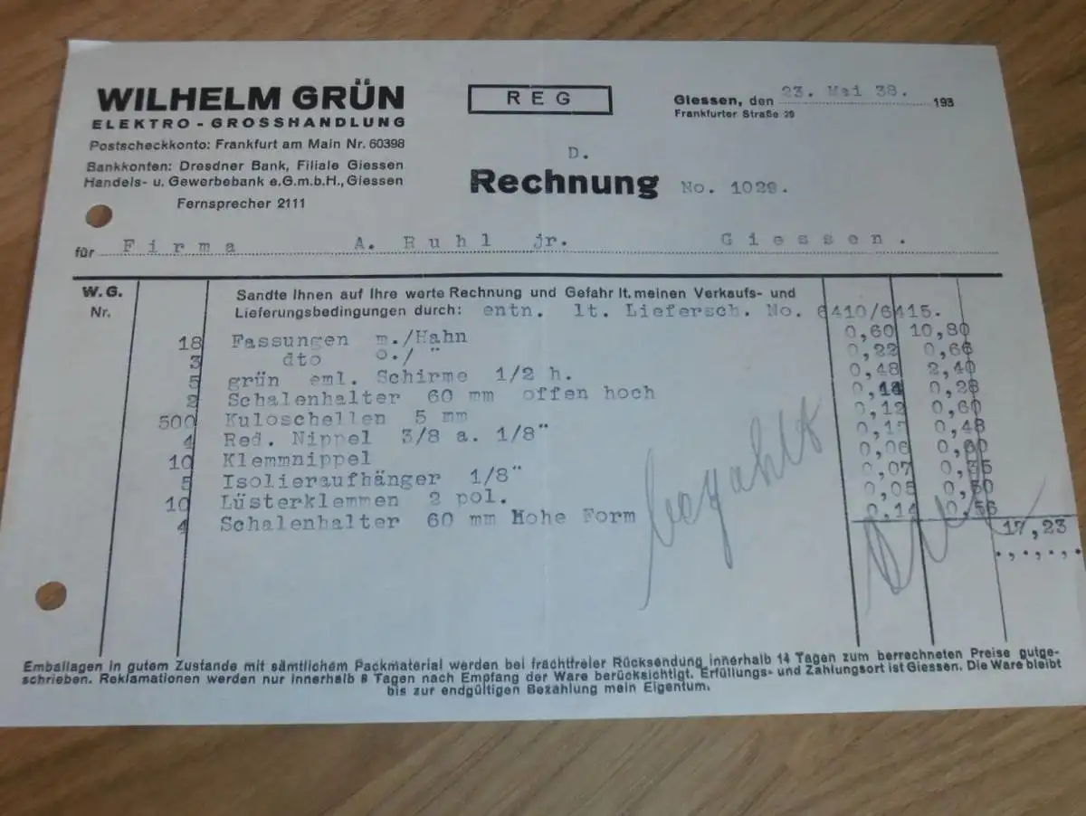 Elektro-Grosshandlung - Wilhelm Grün in Gießen , 1938 , altes Dokument / Rechnung , Reklame / Werbung , Giessen !!