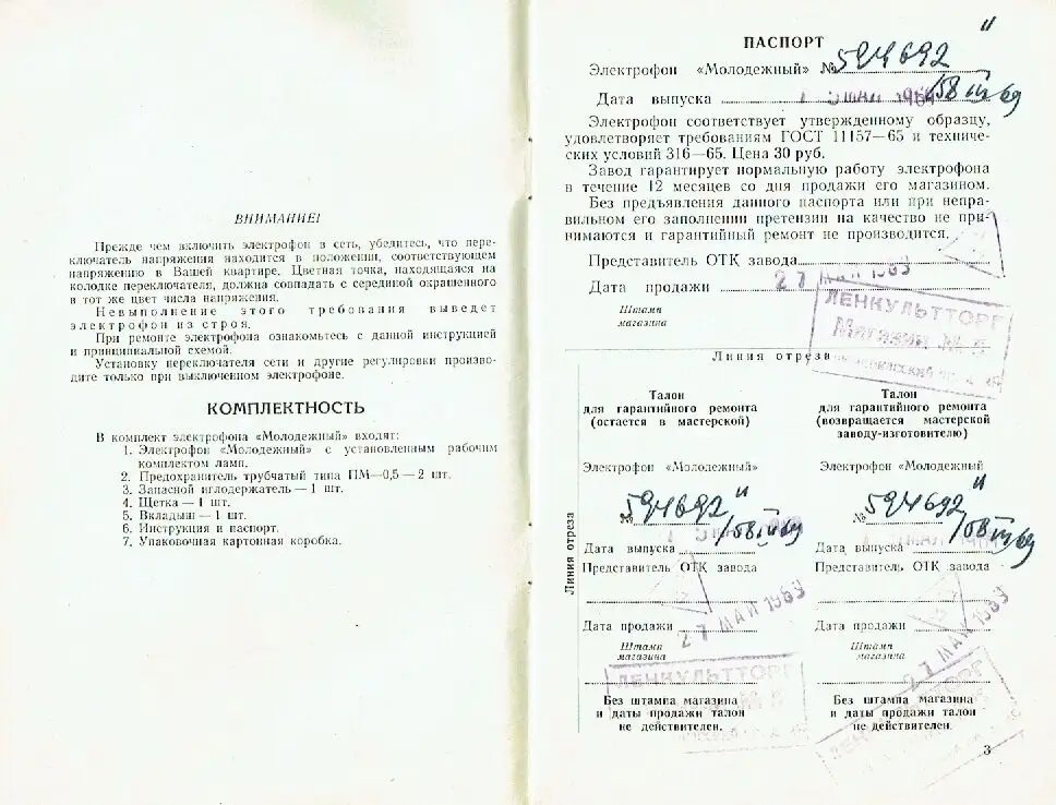 Elektrofon "Molodezhnyy" Instruktsiya.