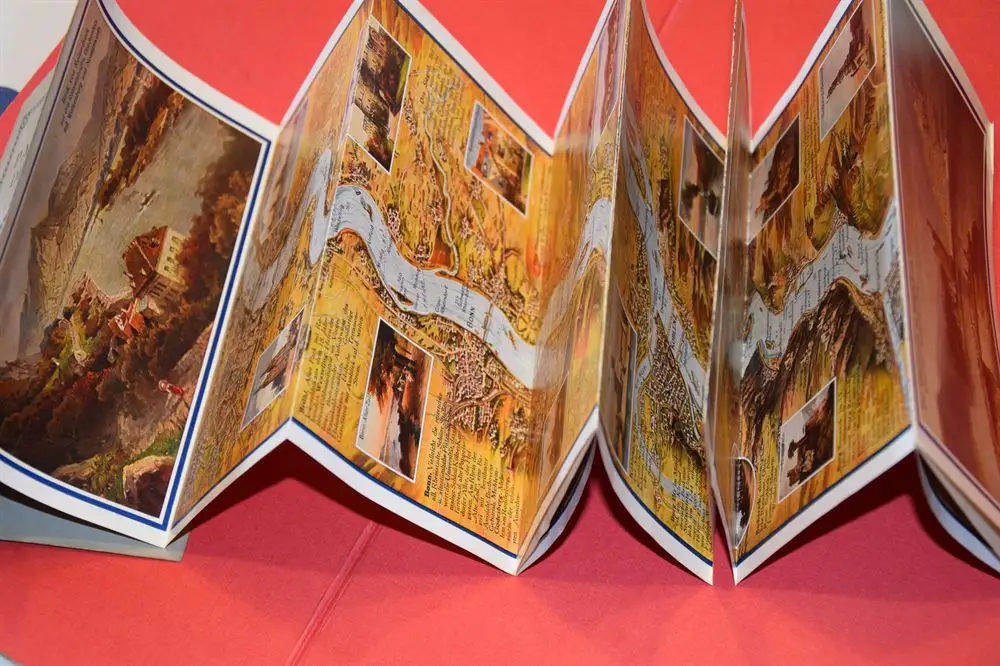 Kolorit v. Gustav Stoeber; Deckel m. deutlichen Gebrauchssp. (ein Fleck, ein Randriss [1 cm], leichte Knicke; Papier angebräunt; Leporello gut erhalten (letzte Seite m. Eckknicke; s. Foto)