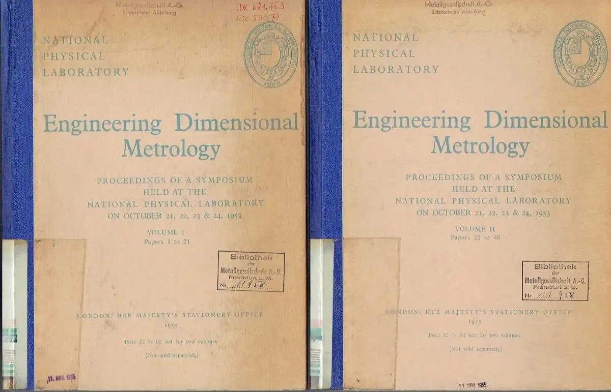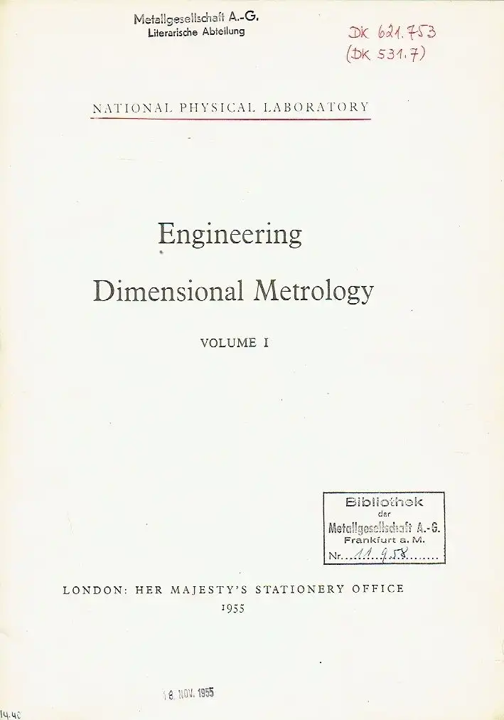 guter Zustand, Gebrauchs- und Alterungsspuren: ehemaliges Bibliotheksexemplar mit Rückenetikett, Etikett mit Folie überklebt bis in beide Buchdeckel hinein - Deckel und Titel mit Stempeln und Notizen - Deckel innen mit angeklebtem Papierrest - Vorsatz mit weiterem Stempel - Seitenschnitt leicht vergilbt, Seiten aber sauber und ordentlich - Einband teils leicht verschmutzt, The Symposium on Engineering Dimensional Metrology was held at the National Physical Laboratory, Teddington, England, from October 21st - 24th, 1953. It was organized by the NationalPhysical Laboratory, Teddington, in co-operation with the Mechanical Engineering Research Laboratory, East Kilbride, Glasgow. The Symposium comprised eight separate sessions, some held concurrently, during which thirty-nine papers were presented. The resulting discussions have been summarized in the Proceedings. Altogether, more than 200 delegates from eight countries attended the Symposium. - The wear on fixed gauges and means to lessen or eliminate its influence H. TORNEBOHM, Aktiebolaget Svenska Kullagerfabriken, Sweden - Measurement in the field of interchangeable manufacture by gauges or indicating appliances G. BERNDT, Technical College, Dresden, Germany - Inspection of prismatic bodies by means of an optical section, and application of this method to turbine blades J. TURRETTINI, Societe Genevoise, Switzerland - Small bore measurement C. O. TAYLERSON - Methods and instruments for measurement of screw threads C. A. LE BOURHIS, Laboratoire Central de l'Armement, France - Methods and equipment of the P.T.B. for testing taper thread gauges K. BURGER, Physikalisch-Technische Bundesanstalt, Germany - Application of statistical quality control M. VERCOUTERE, Compagnie Internationale des Machines Agricoles, France - Statistical techniques and industrial efficiency (the role of routine inspection) B. P. DUDDING, General Electric Co., Ltd. - Discussion - a. m. o, Halbleinen, ca. 20 x 26, 689 Seiten mit zahlreichen Bildern