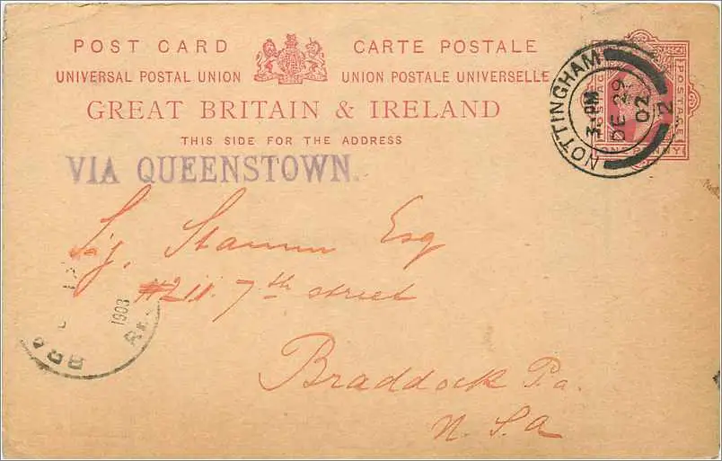 Entier Postal Stationary 1p Nottingham for USA Braddock