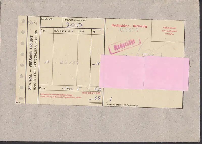Erfurt Nachgebühr Rechnung vom Zentral - Versand 9.11.87