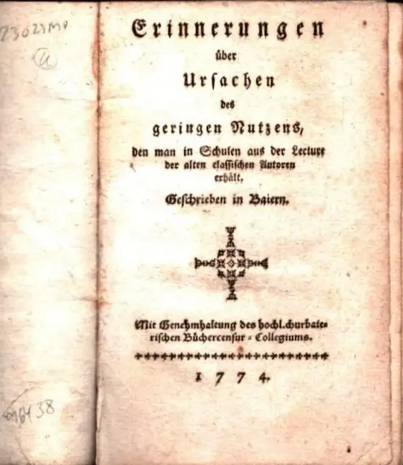 Erinnerungen über Ursachen des geringen Nutzens, den man in Schulen aus der Lecture der alten classischen Autoren erhält. Geschrieben in Baiern. Mit Genehmhaltung des hochl. churbaierischen Büchercensur-Collegiums.