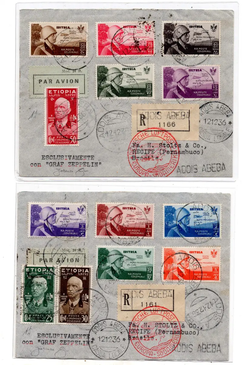 BUSTA - Eritrea - Flug Rom - Mogadischu P.A. n. 7/16 komplette Serie auf zwei Umschlägen Racc. per Luftweg von Addis Abeba nach Brasilien mit Graf Zeppelin aus Frankfurt weitergeleitet - hinten Ann. durch den Transit von Rom, Mailand, Frankfurt und Pernambuco - Selten zusammen in sehr gutem Erhaltungszustand - AD und F. Longhi - Kat. euro 3.000+ Cod.1039/182