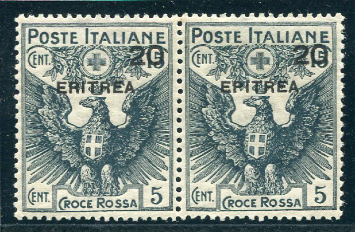 Eritrea - Rotes Kreuz Cent. 20 von 15 EPITREA Fehler Mit Linguella MH - Eritrea - Rotes Kreuz Cent. 20 von 15 Nr. 43 horizontales Paar, das rechte Exemplar mit Epitreasfehler - sehr frisch, sehr gute Zentrierung - Kat. euro 230 Cod. 946/15