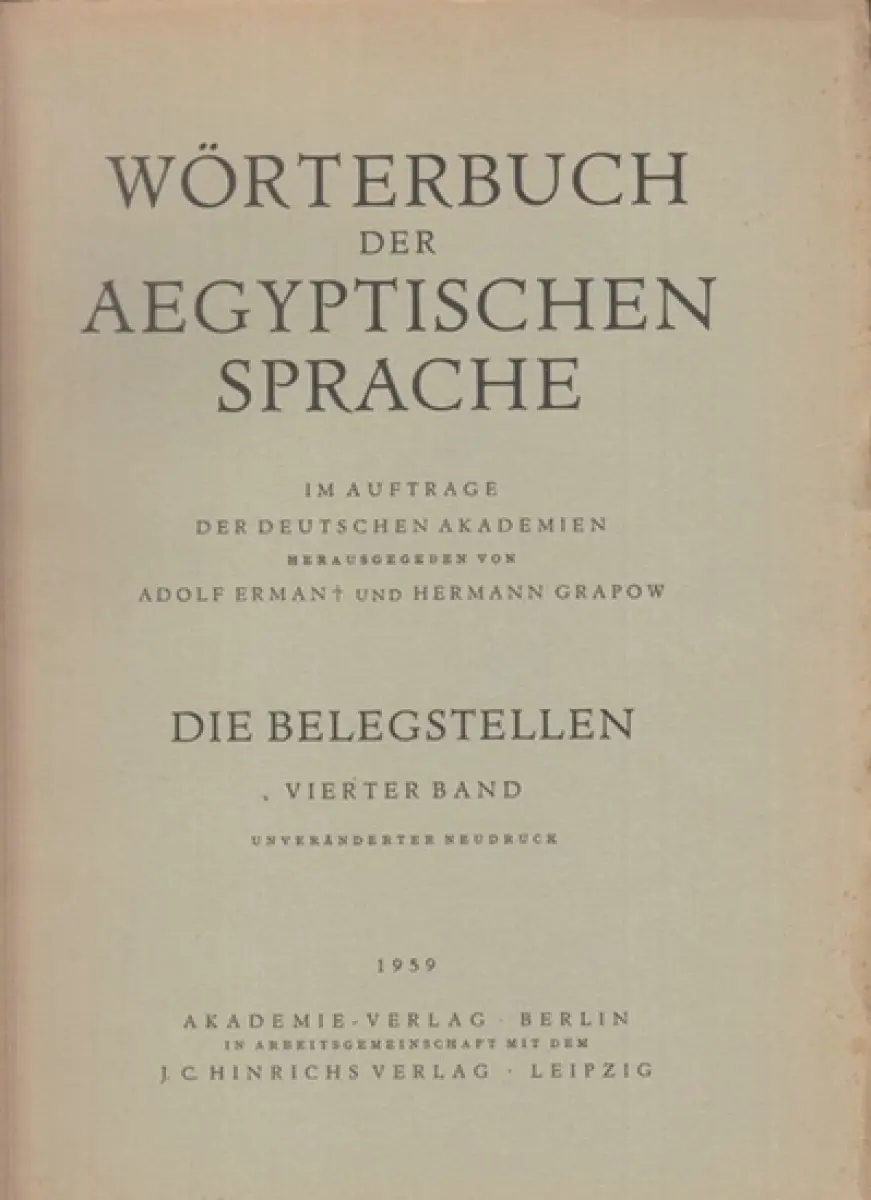 Erman, Adolf - Hermann Grapow (Hrsg.): Wörterbuch der Aegyptischen / Ägyptischen Sprache. Die Belegstellen, vierter Band.
