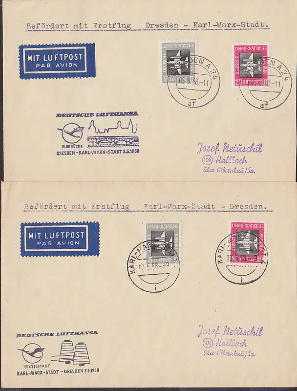 Erstflüge 3.5.58 Karl-Marx-Stadt - Dresden und umgekehrt, Deutsche Lufthansa Cachet Elbebrücke, Textilstadt