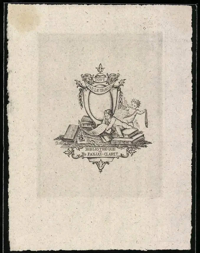 Exlibris Bibliotheque Elie Fanjas - Claret, Putten vor Wappenschild auf Büchern und Dokumenten