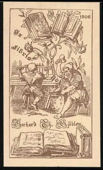 Exlibris Bierhard Th. Sjöblom, Buchdruckerei, Drucker während der Arbeit