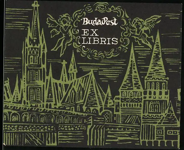 Exlibris Budapest, Stadtansicht mit Brücke und Kirchtürmen