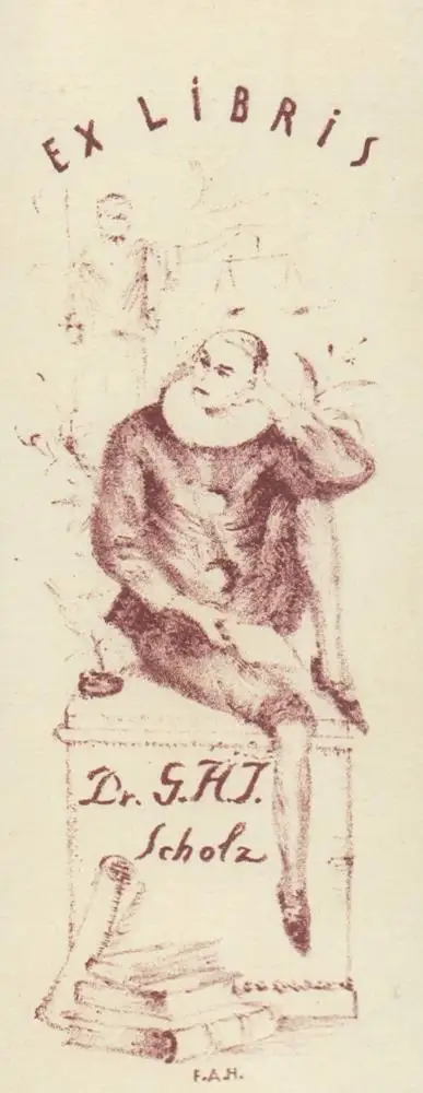 Titel: Exlibris. Ex Libris Dr. G. H. J. Scholz. Rötelfarbene Lithographie. (Im Stein monogrammiert F.A.H.)