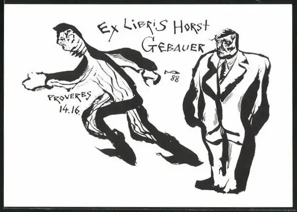 Exlibris Horst Gebauer, Mann rennt vor einem anderen Mann im Anzug davon