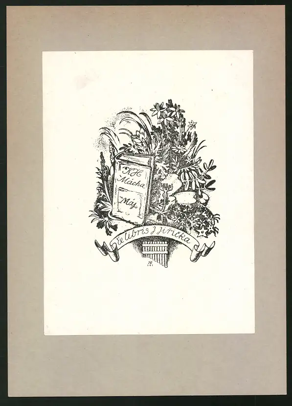 Exlibris J. Jiricka, Buch auf einem Beet mit vielen Blumen