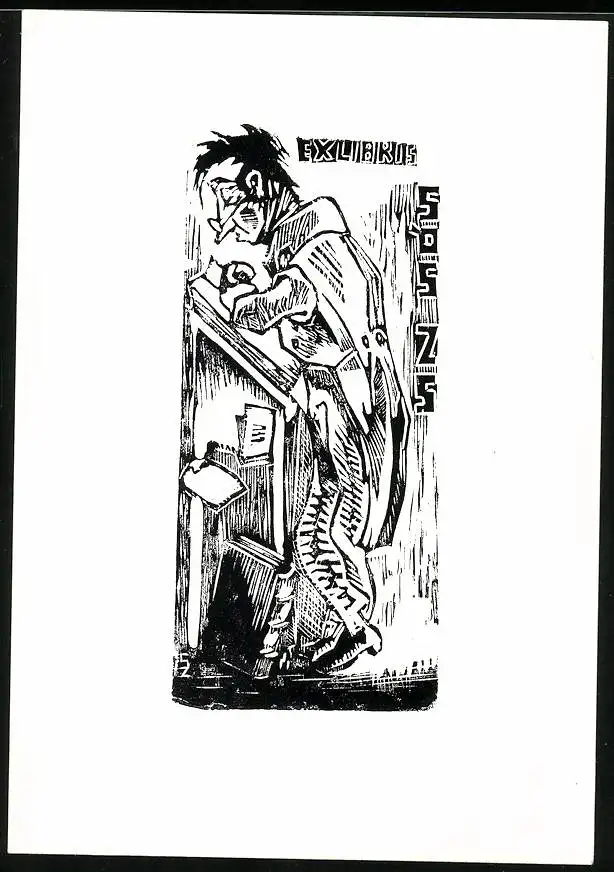 Exlibris Mann an einem Pult stehend beim Lesen eines Buches