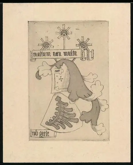Exlibris Rob Geete, Ritterhelm mit Metallaplikation und Wappenschild mit Schwinge