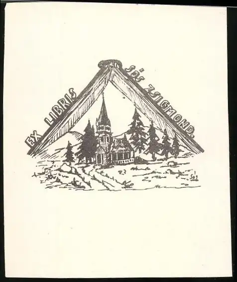 Exlibris Sos Zsigmond, Kirche unter einem aufgestellten Buch