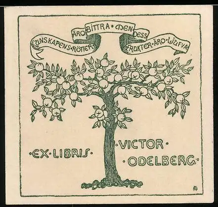 Exlibris Victor Odelberg, Apfelbaum und Banner, grün