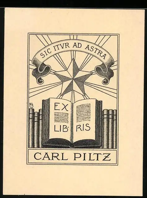 Exlibris von Arthur Sjögren für Carl Piltz, offenes Buch, Stern, Banner mit Spruch auf lateinisch