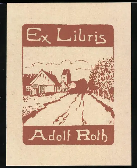 Exlibris von Axel Nilsson für Adlf Roth, Strassenpartie mit Ortsansicht, rot