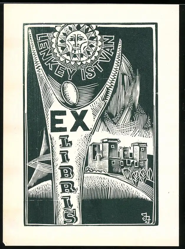 Exlibris von Janos Jozsa für Lenkey Istvan, Stabspitze mit Sonnensymbol über einer Festung