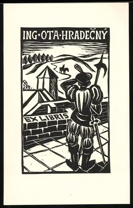 Exlibris von Michael Florian für Ing. Ota. Hradecny, Wachposten mit Hellebarde auf Burgmauer stehend