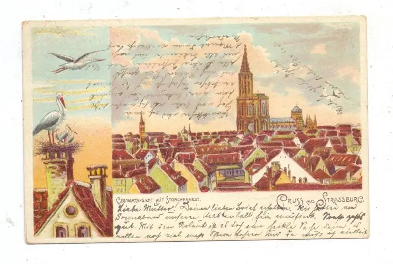 F 67000 STRASBOURG / STRASSBURG, Lithographie 1901, Gesamtansicht und Storchenest