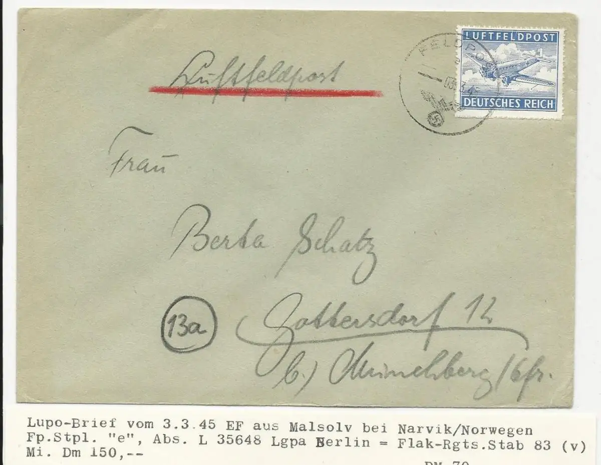 FP WK II 1945, Luft Feldpost Brief v. Masolv bei Narvik, Norwegen. #2317