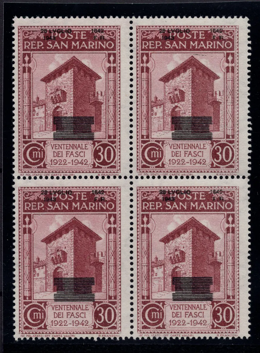 MNH - Vollgummi - Fall des Faschismus Cent. 30 n. 257e Viertel mit stark nach oben verschobenem Aufdruck, so dass der Schriftzug Venetennale dei Fasci vollständig sichtbar ist, neuer perfekter Vollgummi - Kat. euro 520 Cod. 3114/WEB