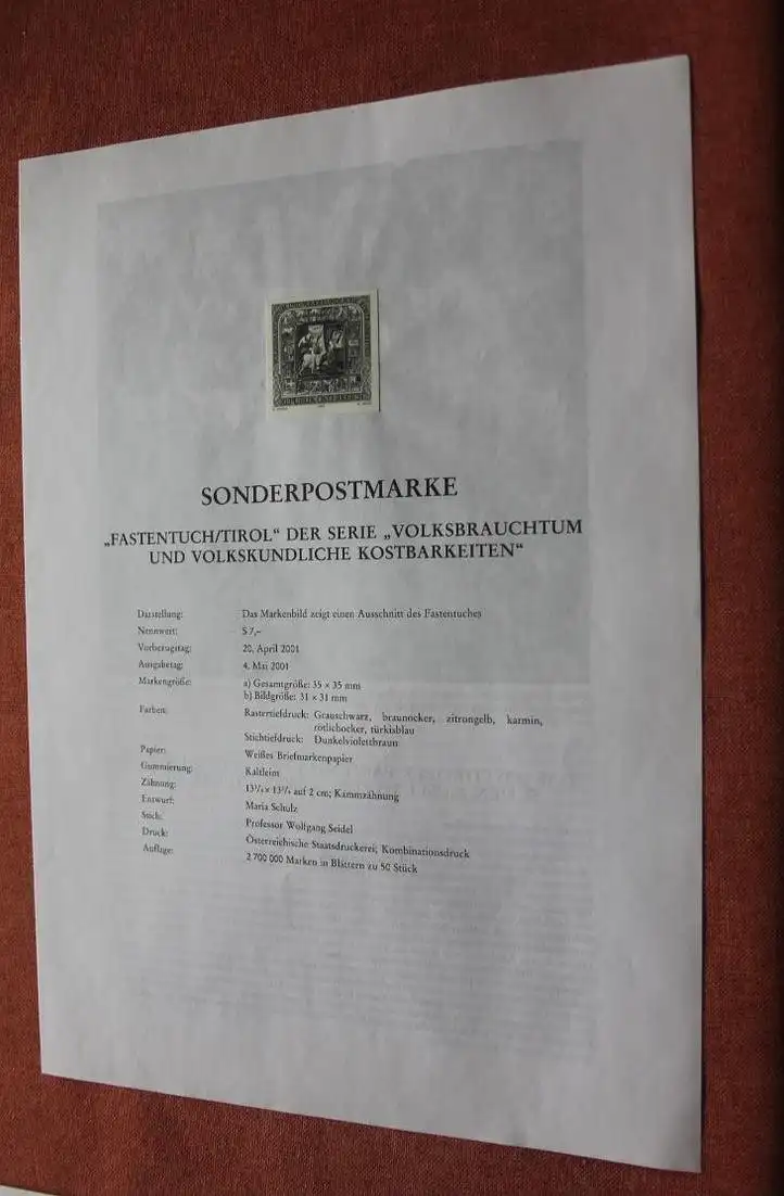 Fastentuch / Tirol; Österreich, Amtl. Schwarzdruck auf Erläuterungsblatt,; 4. Mai 2001