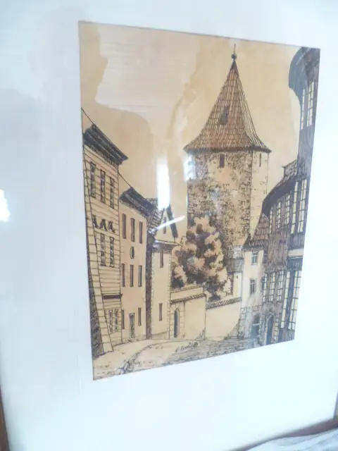 Federzeichnung Stadtstaffage mit Turmanlage in Baden Württemberg oder Pfalz Art Deko signiert