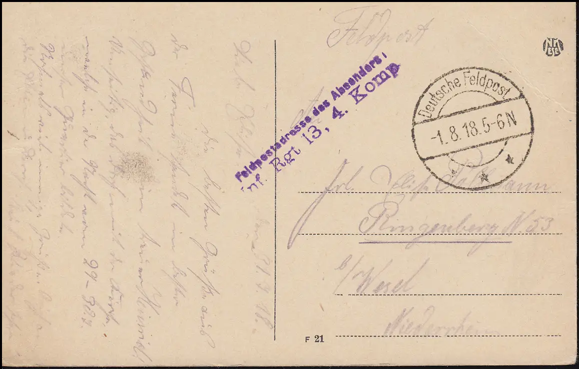 Feldpost-Reisent 13, 4. Compar. Deutsche Field Post 1.8.18 sur carte de visualisation