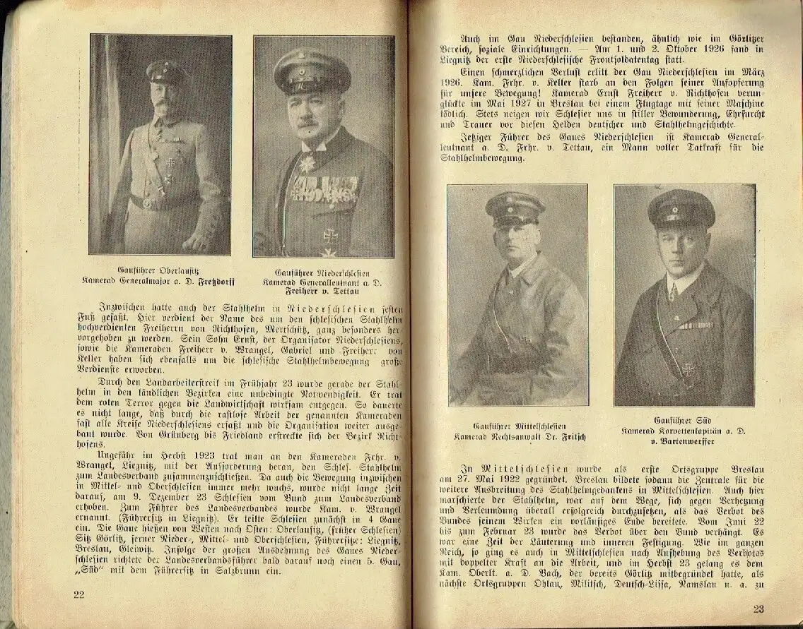 mittlerer bis noch guter Zustand, Gebrauchs- und Alterungsspuren: Umschlag verschmutzt - Umschlag und Seiten teils mehr oder weniger eselsohrig - Rückseite unten mit größerem Eselsohr - der unterste Zentimeter des Rückens etwas defekt - Papier teils etwas vergilbt, aber Seiten überwiegend sauber und ordentlich - die ersten 20 Seiten mit schmalem Wasser- und Schmutzfleck entlang des oberen Randes - etwas verstaubt, Gruß- und Willkommensworte - Entstehungs- und Entwicklungsgeschichte des schlesischen Stahlhelms - Stahlhelm und Religion - Oppeln - Friedrichs des Großen Kampf um Schlesien - Programm - Liedertexte - Parteigeist wider Frontgeist - Schlesiens Not - Der Irrtum des Internationalismus - Schlesiens geschichtlicher Werdegang - Deutschland und Osteuropa in Geschichte, Weltkrieg und Zukunft - Der Voater erzählt vom Kriege, kartoniert, ca. 15,5 x 22,5, 88 Seiten mit einigen Bildern und Geschäftsanzeigen