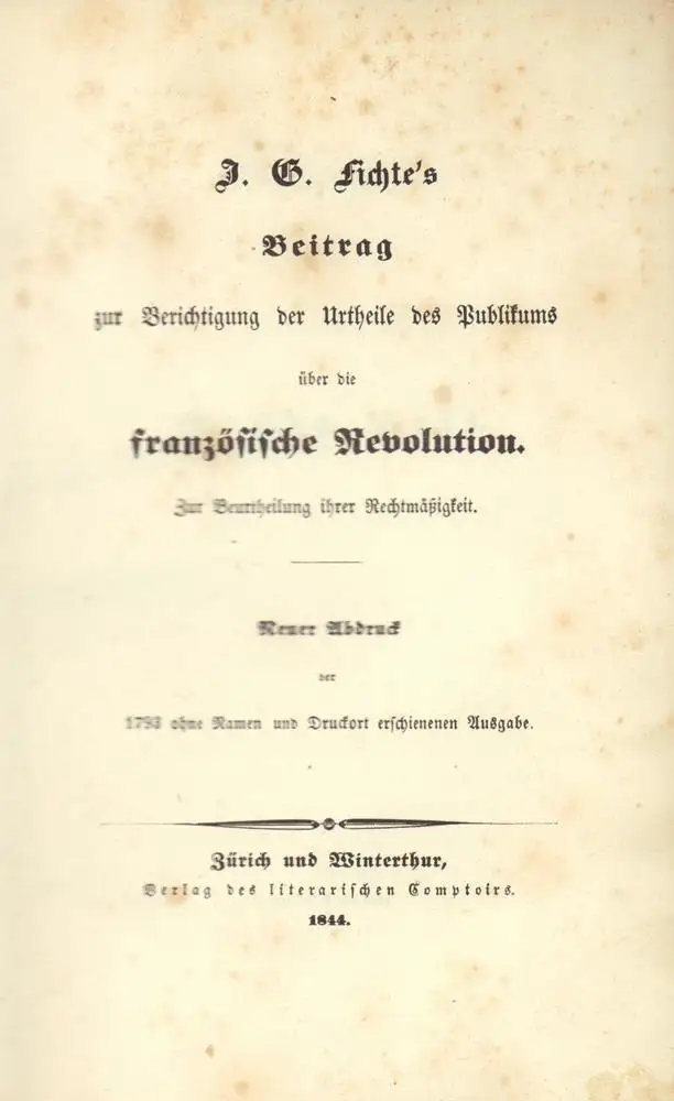 Titel: J. G. Fichte's Beitrag zur Berichtigung der Urtheile des Publikums über die französische Revolution. Zur Beurtheilung ihrer Rechtmäßigkeit. Neuer Abdruck der 1793 ohne Namen und Druckort erschienenen Ausgabe