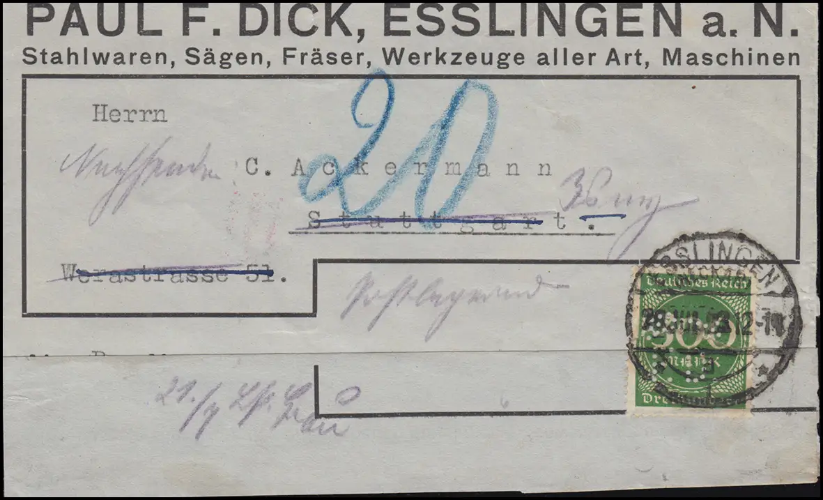 Perfin de la société Paul F. Dick - Articles en acier, scie, fraise et outils de tous types, mailen - à Esslingen am Neckar sur la face avant-poste vers Stuttgart / correction manuscrite / postporto Contrôle: original Référence produit: 00000000032840>Remarque: Cet article n'est disponible qu'une seule fois. Vous recevrez exactement l'article illustré.