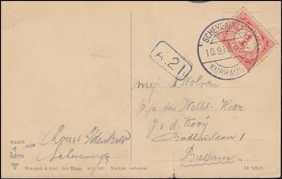 Trou de l'entreprise/Perfin 2 à 50 chiffres EF sur AK Boulevard SCHEVENINGEN 10.9.15
